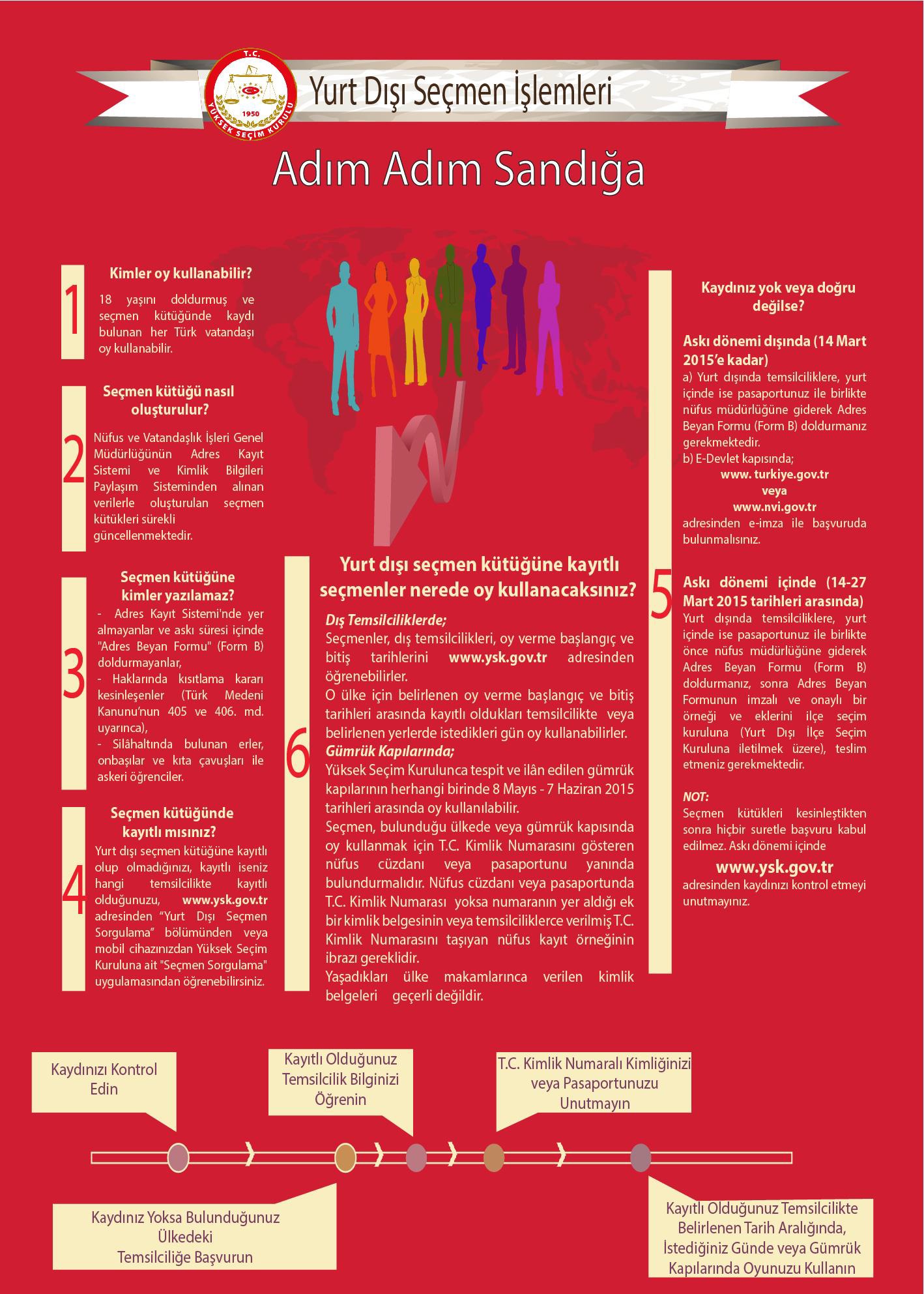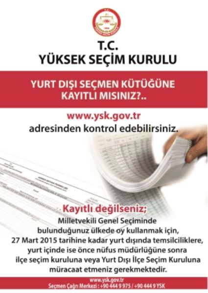 Vatandaşlarımız Yurtdışı Seçmen Kütüğü kayıtlı olup olmadıklarını Yüksek Seçim Kurulu’nun (YSK) www.ysk.gov.trweb sitesi Yurtdışı Seçmen Sorgulama sayfasındankontrol edebilirler.